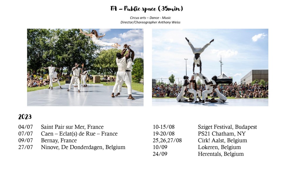 FA is a project combining contemporary writing with ethnic traditions. The show direction and choreography of Anthony Weiss combined with the acrobatic art of this group creates a singular writing where the acrobat dancer, individually and in the collective, is the central point of this piece.